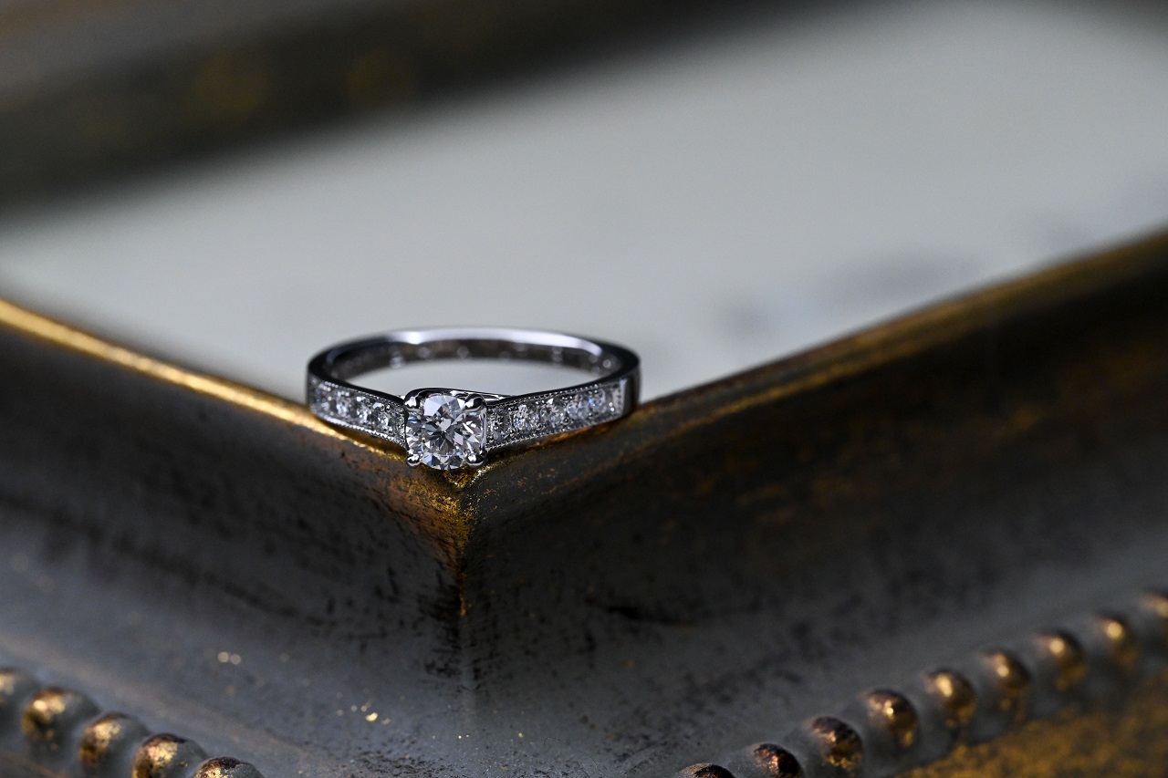 腕にメレダイアを配した4本爪の0.3ctのエンゲージリング。ルースからお選び頂いてリングを製作する事も、今回のように引き継がれた大切なダイアモンドを使用してのリング製作も可能です。大切な想いの込められている受け継がれたダイアモンドを使用した素敵なエンゲージリングになります。