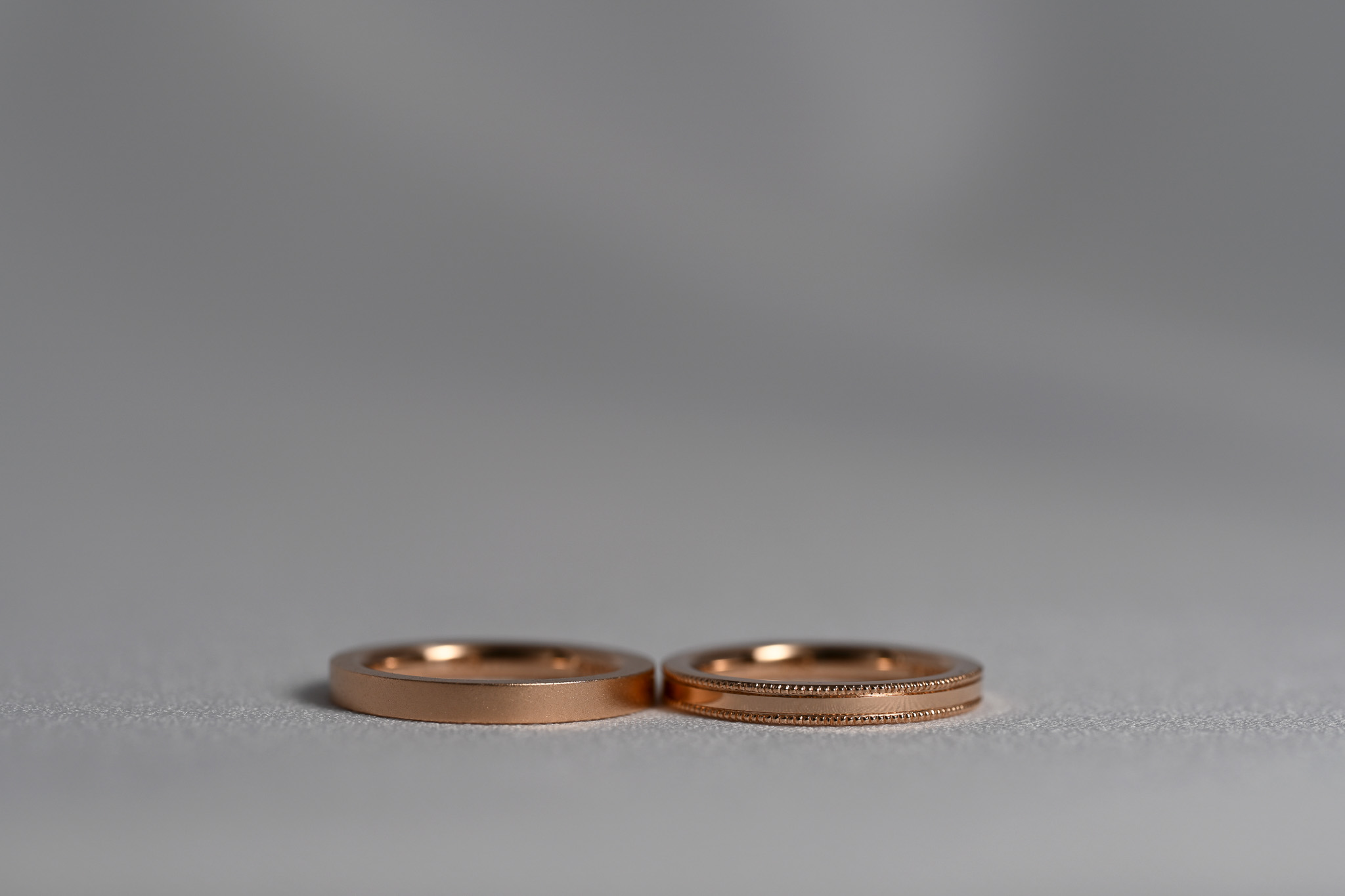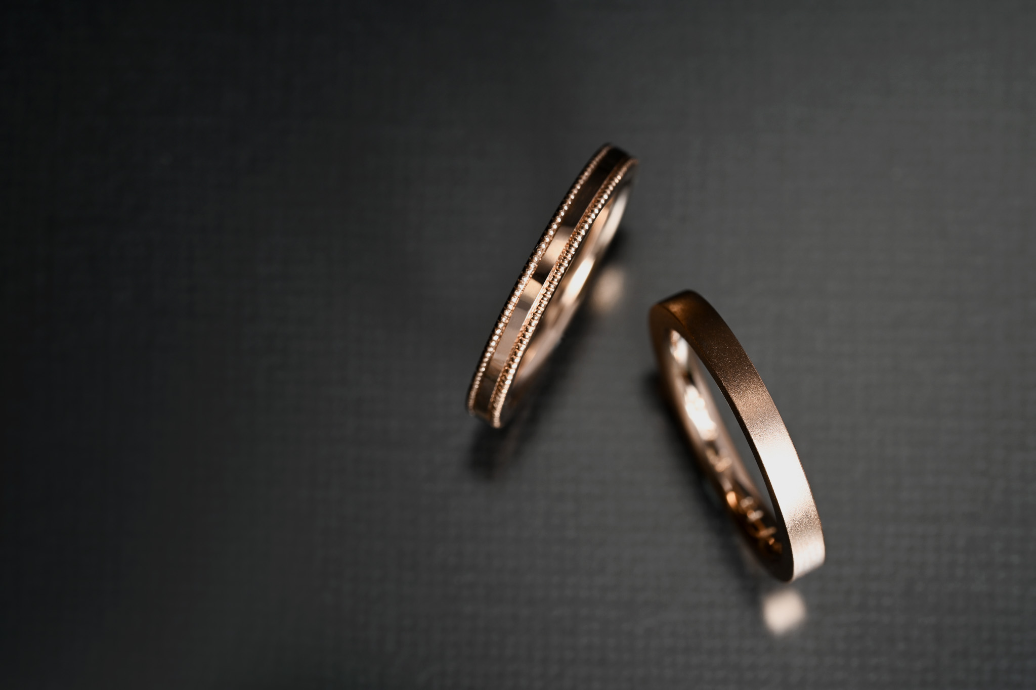K18ピンクゴールドのストレートラインの渋いサンドブラスト仕上げと両端にミルグレインを施したアンティークスタイルのマリッジリング。