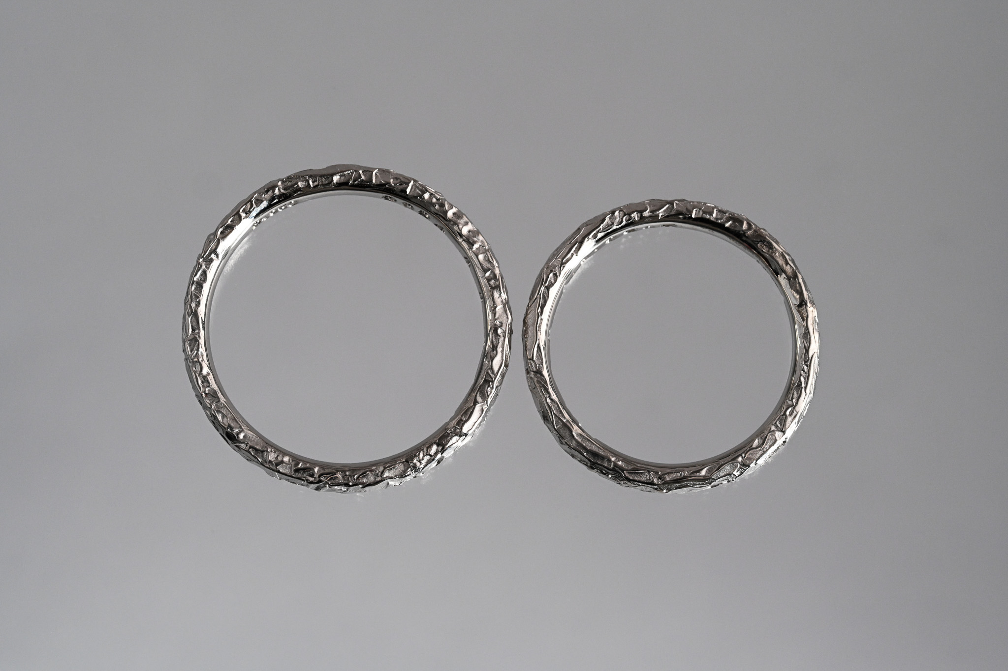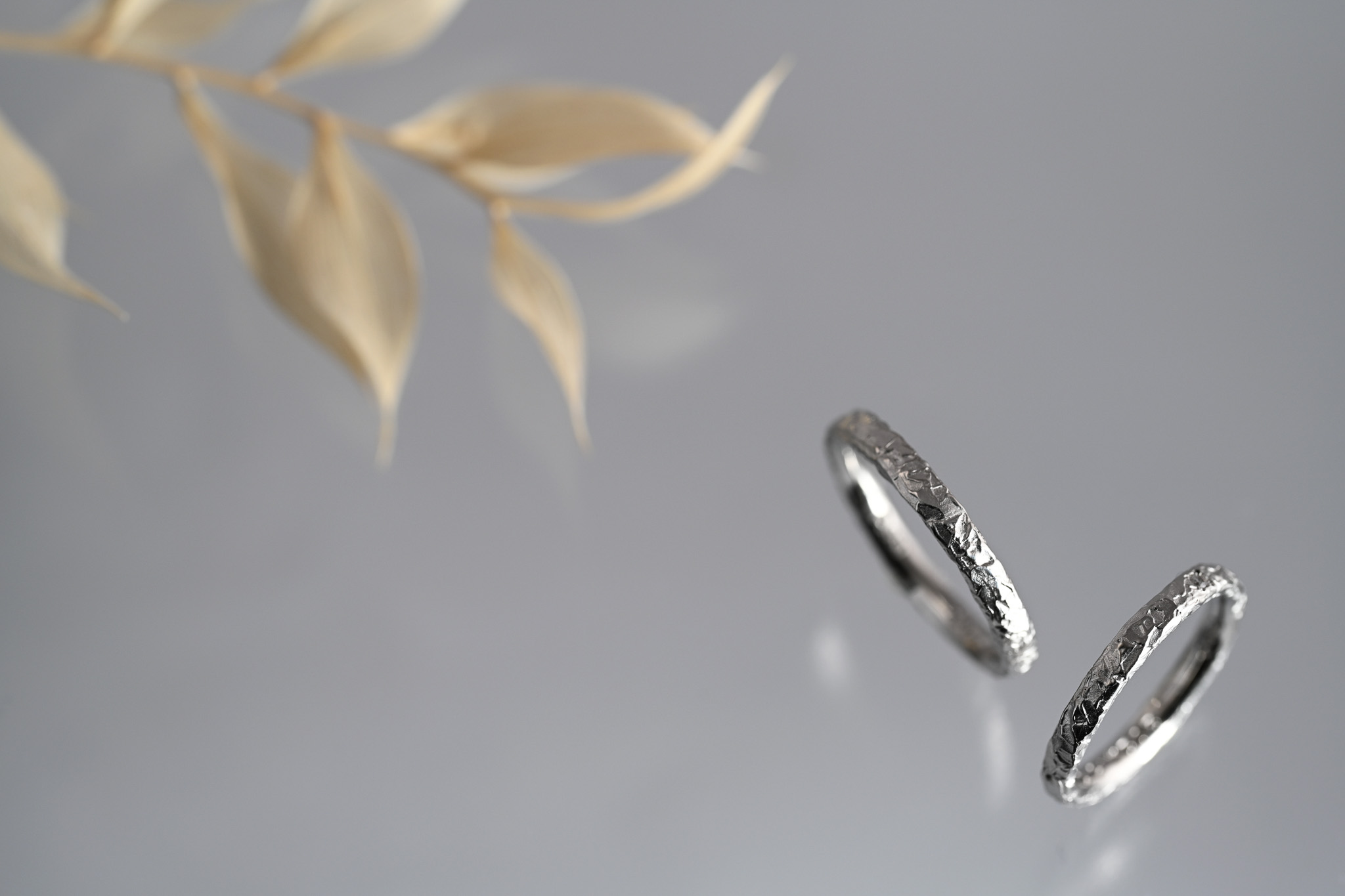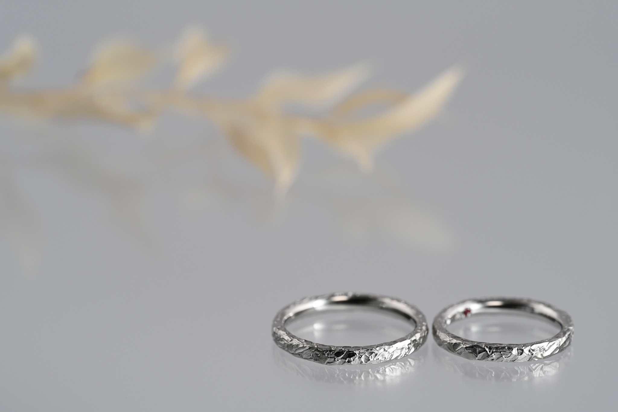 プラチナのストレートラインに大地、自然を感じさせるアーステクスチャーが施してあるマリッジリング