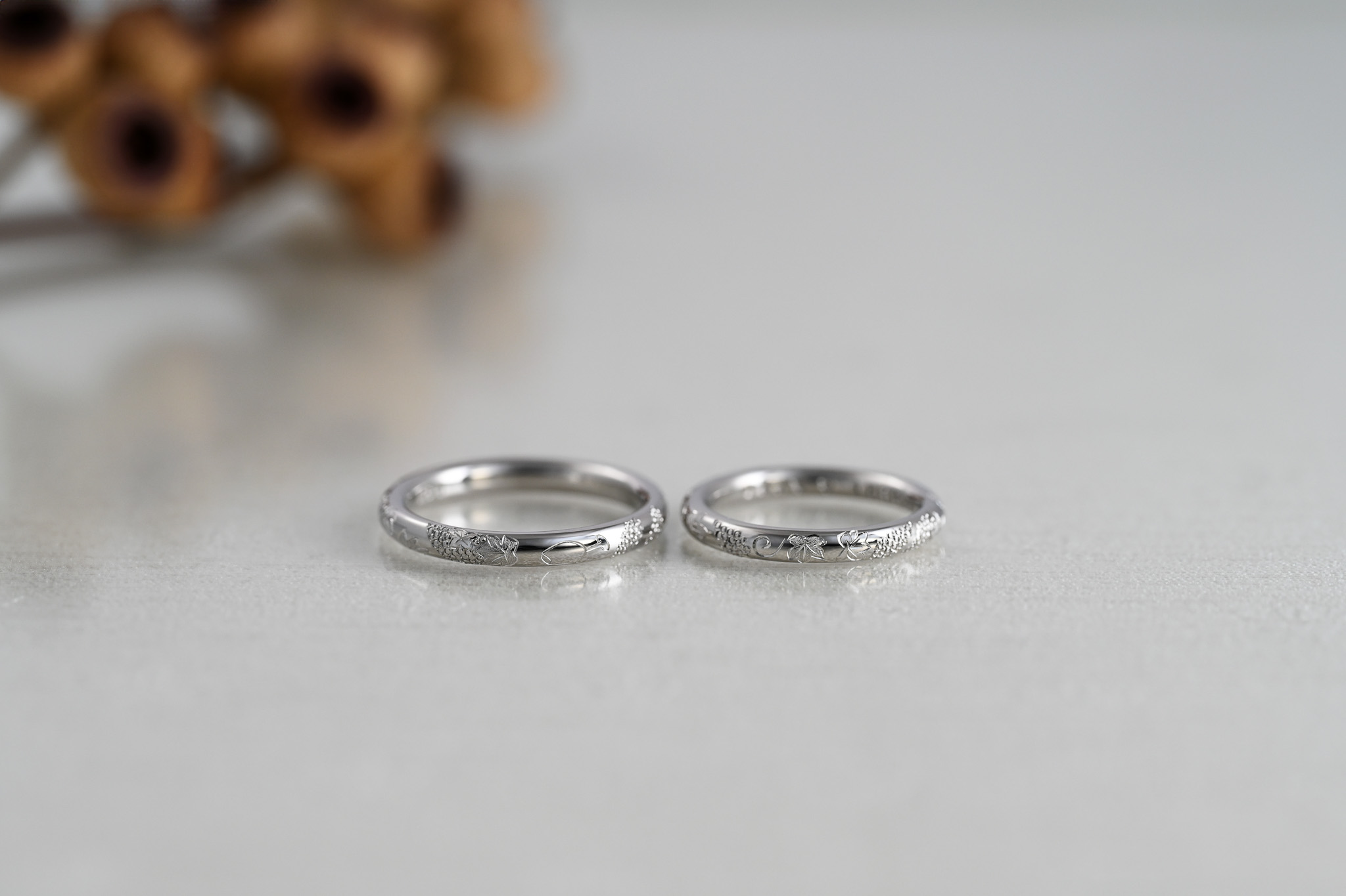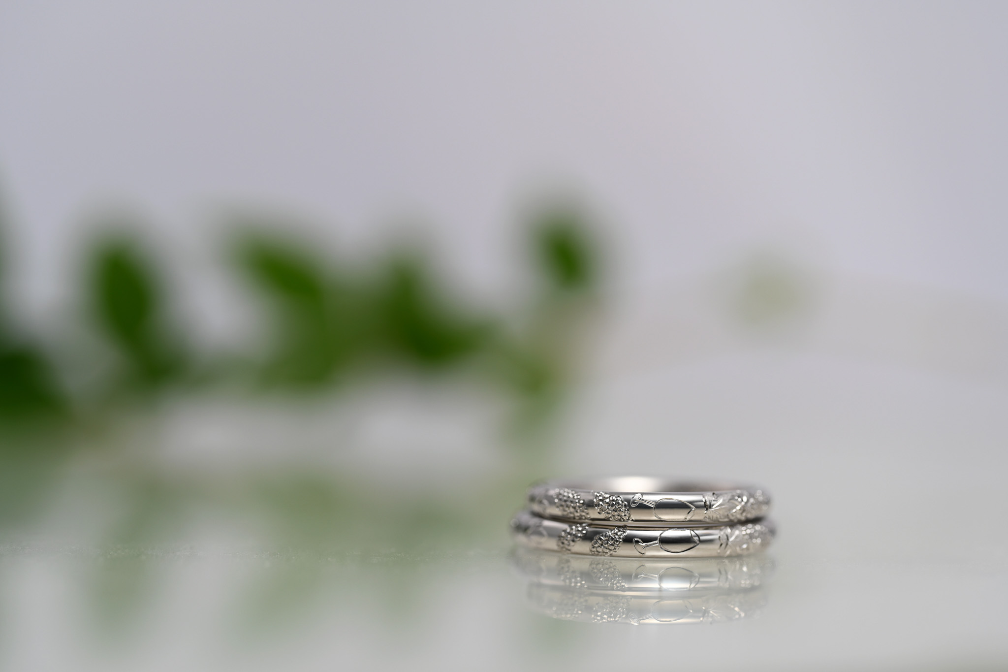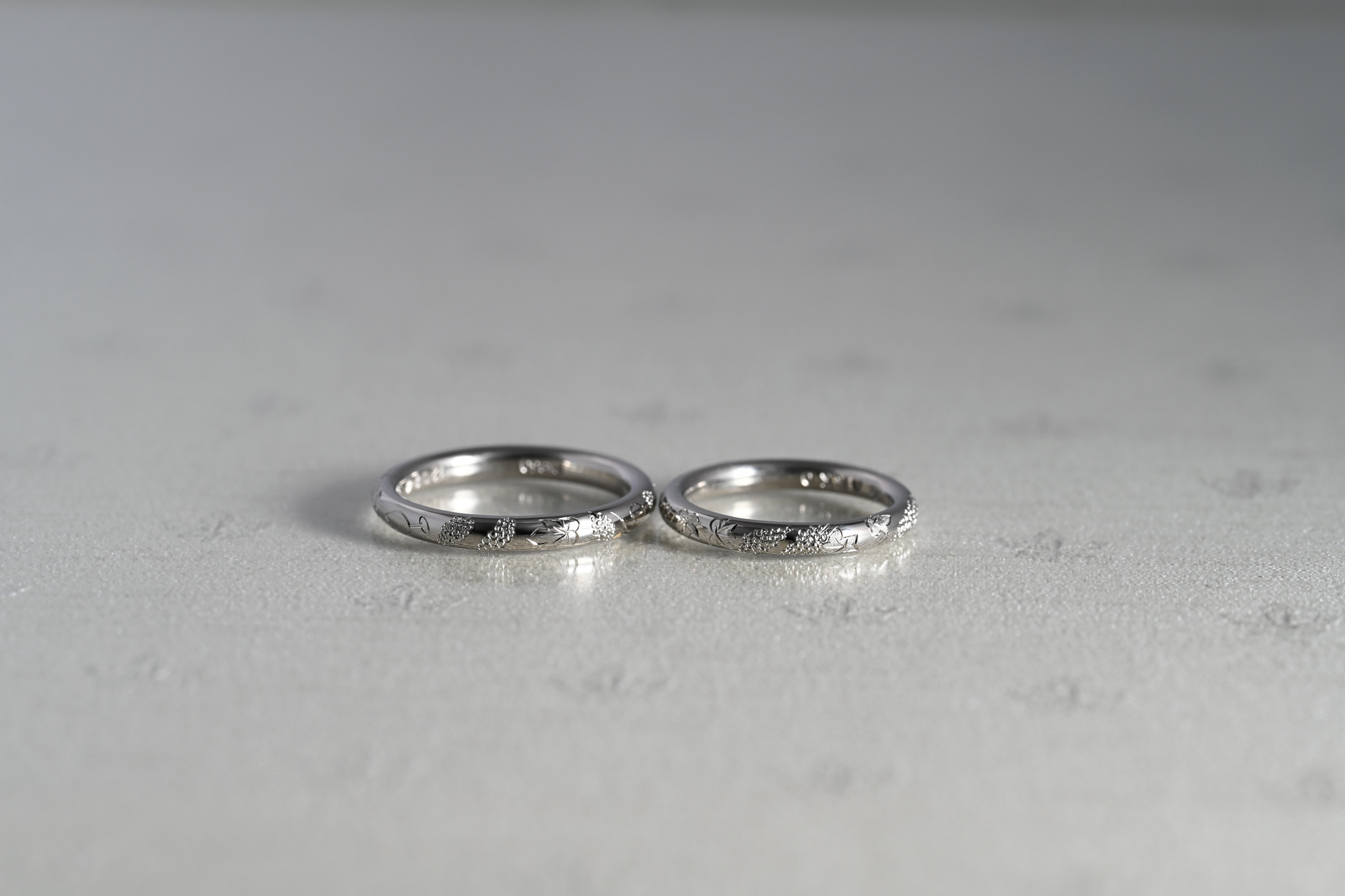 プラチナのストレートラインに葡萄の木をリング全体に手彫りで表現しました。たわわに実った葡萄、葡萄のつるや葉の躍動感を詰め込んだ職人技の粋。彫られたワイングラスでおふたりだけの乾杯を楽しんで頂けます。
